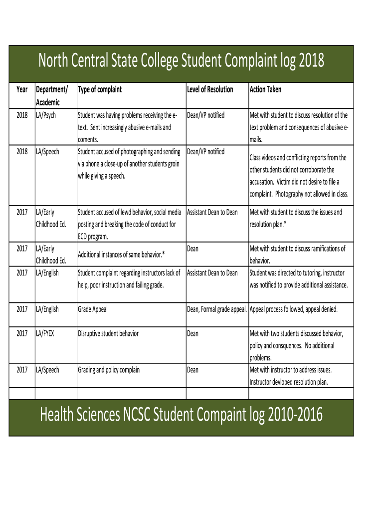 Get the free North Central State College Student Complaint log 2018