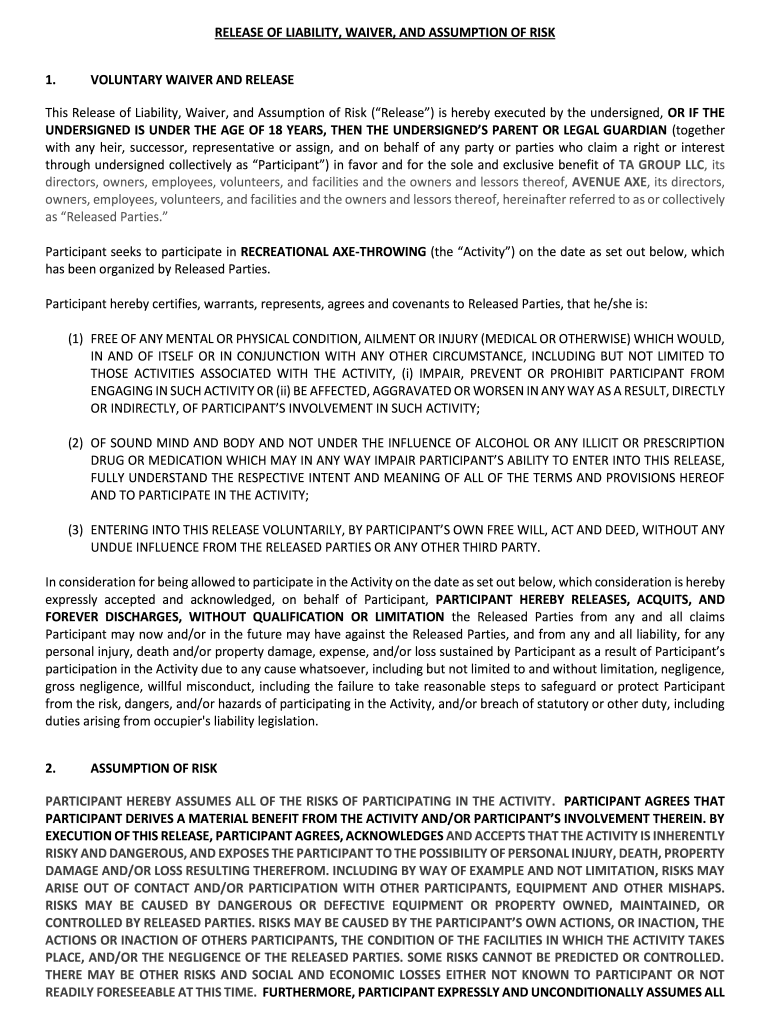 1.VOLUNTARY WAIVER AND Releases Release of Liability, Waiver, and Assumption of Risk (Release) is hereby executed by the undersigned, OR IF THE