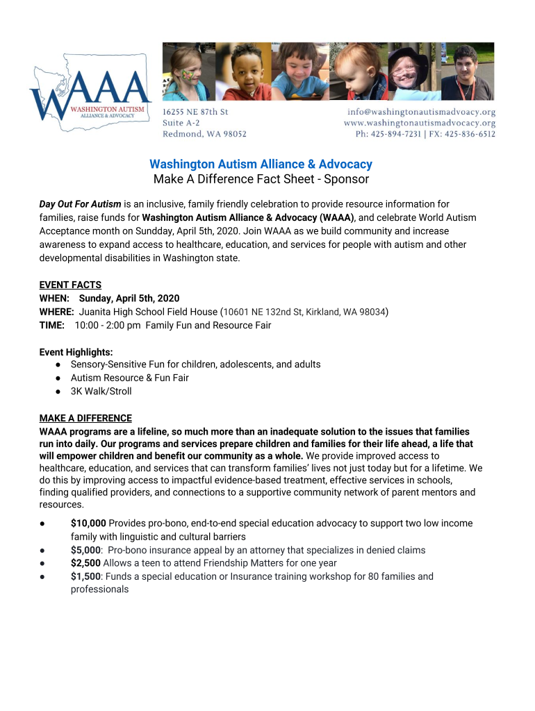 Washington Autism Alliance & Advocacy Make A Difference Fact Sheet Sponsor Day Out For Autism is an inclusive, family friendly celebration to provide resource information for families, raise funds