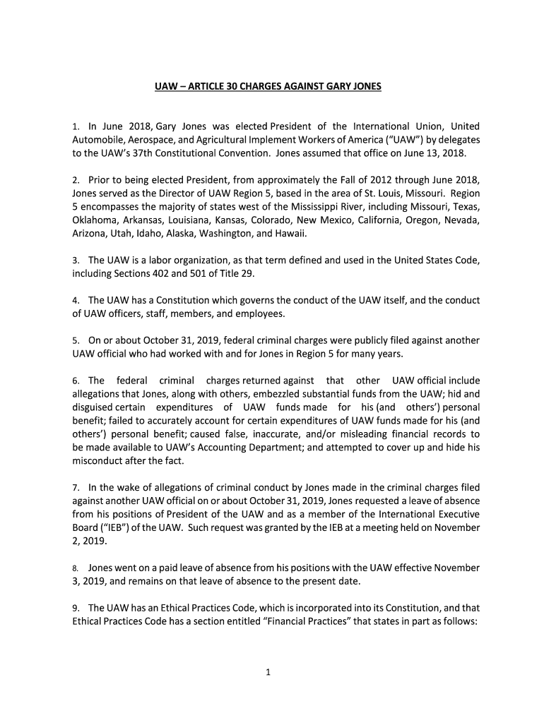 Get the free Here are the UAW's Article 30 charges against Gary Jones