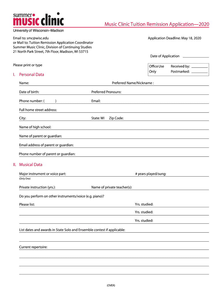 UW SMC Music Clinic Tuition Remission Application - Madison 2020-2026 free printable template