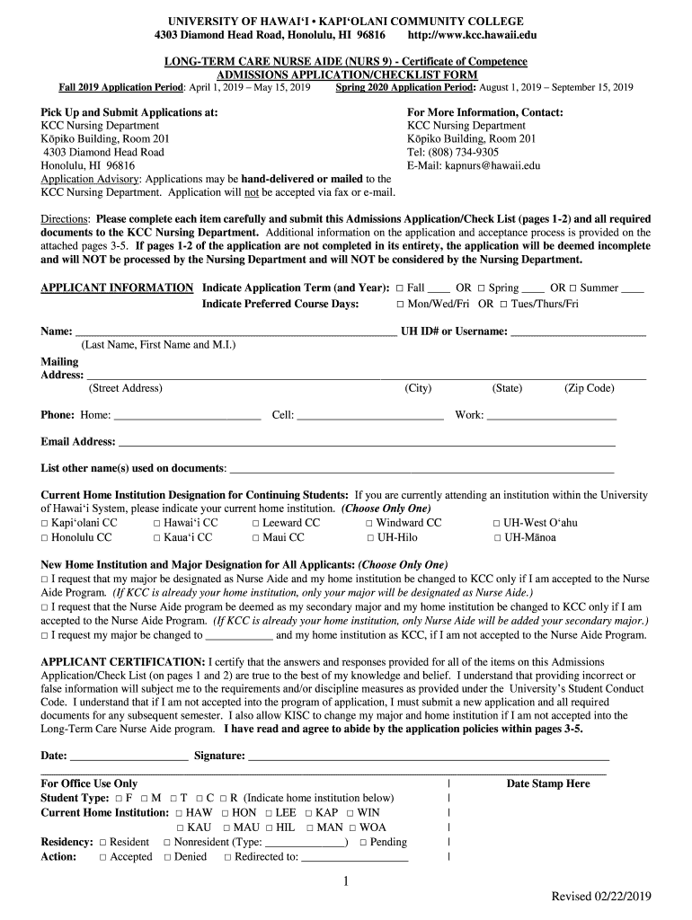 UNIVERSITY OF HAWAII KAPLAN COMMUNITY COLLEGE 4303 Diamond Head Road, Honolulu, HI 96816 http://www.kcc.hawaii.edu LONGER CARE NURSE AIDE (NURSE 9) Certificate of Competence ADMISSIONS APPLICATION/CHECKLIST