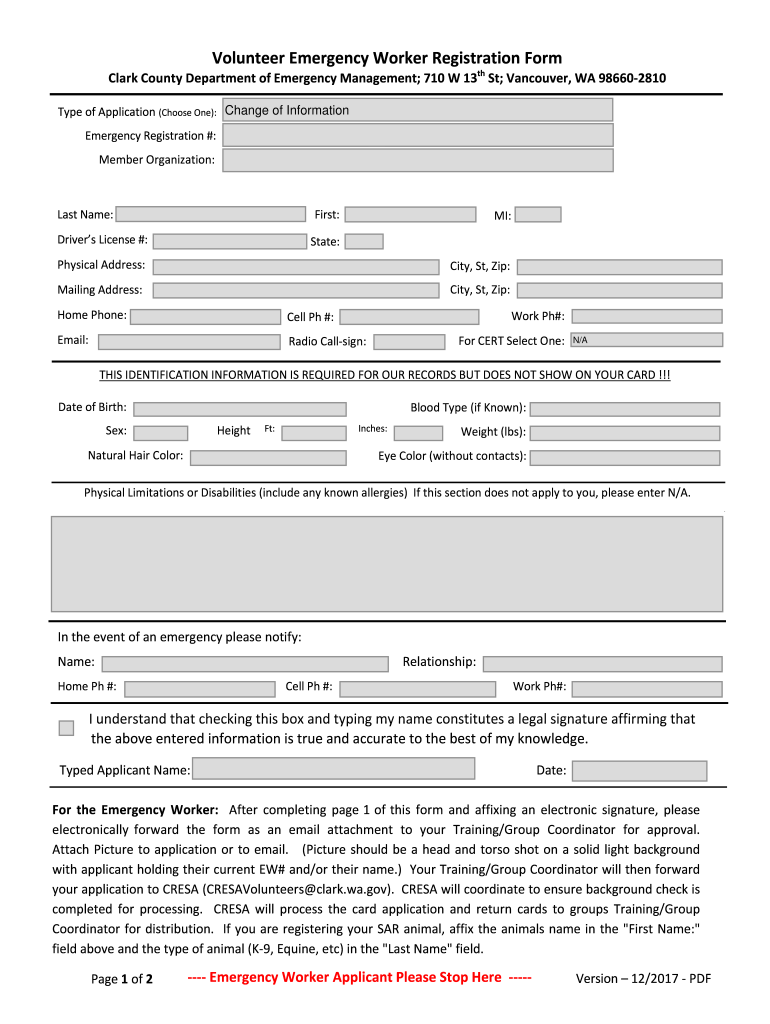 Volunteer Emergency Worker Registration Form Clark County Department of Emergency Management; 710 W 13th St; Vancouver, WA 986602810