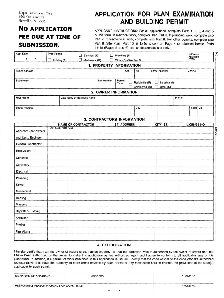 APPLICATION FOR PLAN EXAMINATION AND BUILDING PERMITUpfEr Tulpehocken TwD650l Old Route 22 Belville, Pa I9506No lppucATroil FEE DUE Ar Rome SUBMISSION. App. Dal6P,nit El guitar tail TvpeoFAppLlcANT