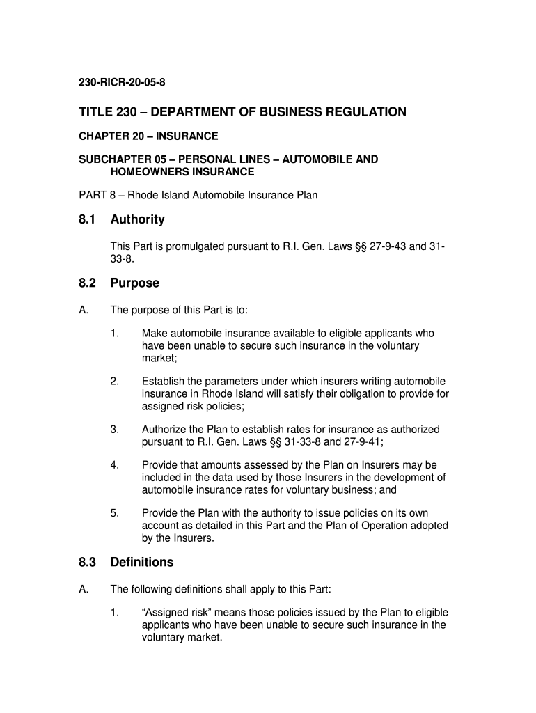 230RICR20058TITLE 230 DEPARTMENT OF BUSINESS REGULATION CHAPTER 20 INSURANCE SUBCHAPTER 05 PERSONAL LINES AUTOMOBILE AND HOMEOWNERS INSURANCE PART 8 Rhode Island Automobile Insurance Plan8.1Authority