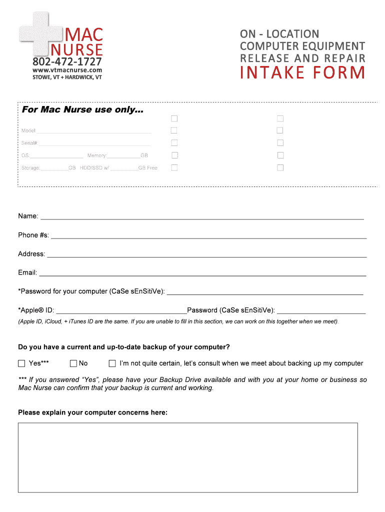 For Mac Nurse use only !! Model: !! Serial#: !!OS: Memory: GB!! Storage: GB HDD/SSD w/ GB Free!! Name: Phone #s: Address: Email: *Password for your computer (Case sensitive): *Apple ID: Password (Case