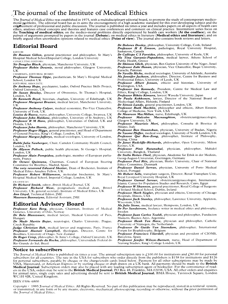 The j7ournal medical Ethics was established in 1975, with a multidisciplinary editorial board, to promote the study of contemporary medico moral problems.