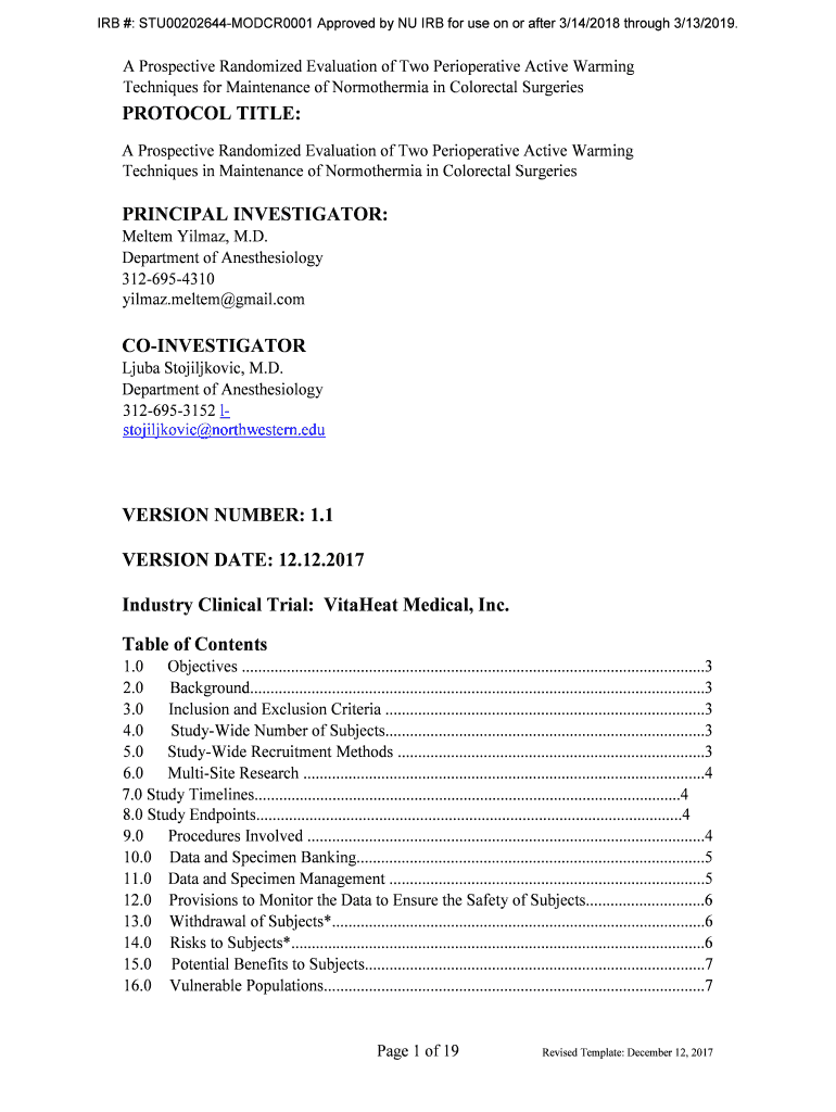 IRB #: STU00202644MODCR0001 Approved by NU IRB for use on or after 3/14/2018 through 3/13/2019. A Prospective Randomized Evaluation of Two Perioperative Active Warming