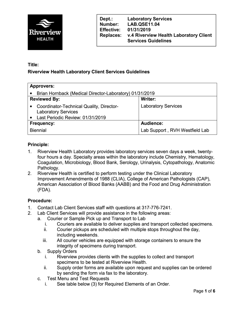 Dept.: Number: Effective: Replaces:Laboratory Services LAB.QSE11.04 01/31/2019 v.4 Riverview Health Laboratory Client Services GuidelinesTitle: Riverview Health Laboratory Client Services Guidelines