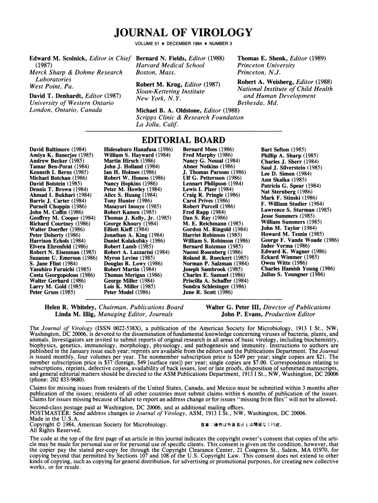 JOURNAL OF VIROLOGY VOLUME 51 * DECEMBER 1984 * NUMBER 3Edward M. Colwick, Editor-in-Chief Bernard N. Fields, Editor (1988) Harvard Medical School (1987) Boston, Mass. Merck Sharp & Dome ResearchLaboratories