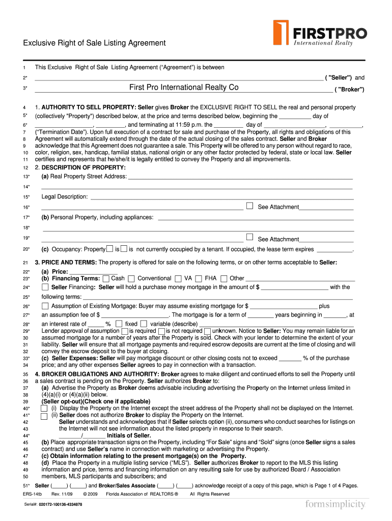 Exclusive Right of Sale Listing Agreement 1This Exclusive Right of Sale Listing Agreement (Agreement) is between2* (“Seller “) and3×First Pro International Realty Co (“Broker “)41. AUTHORITY
