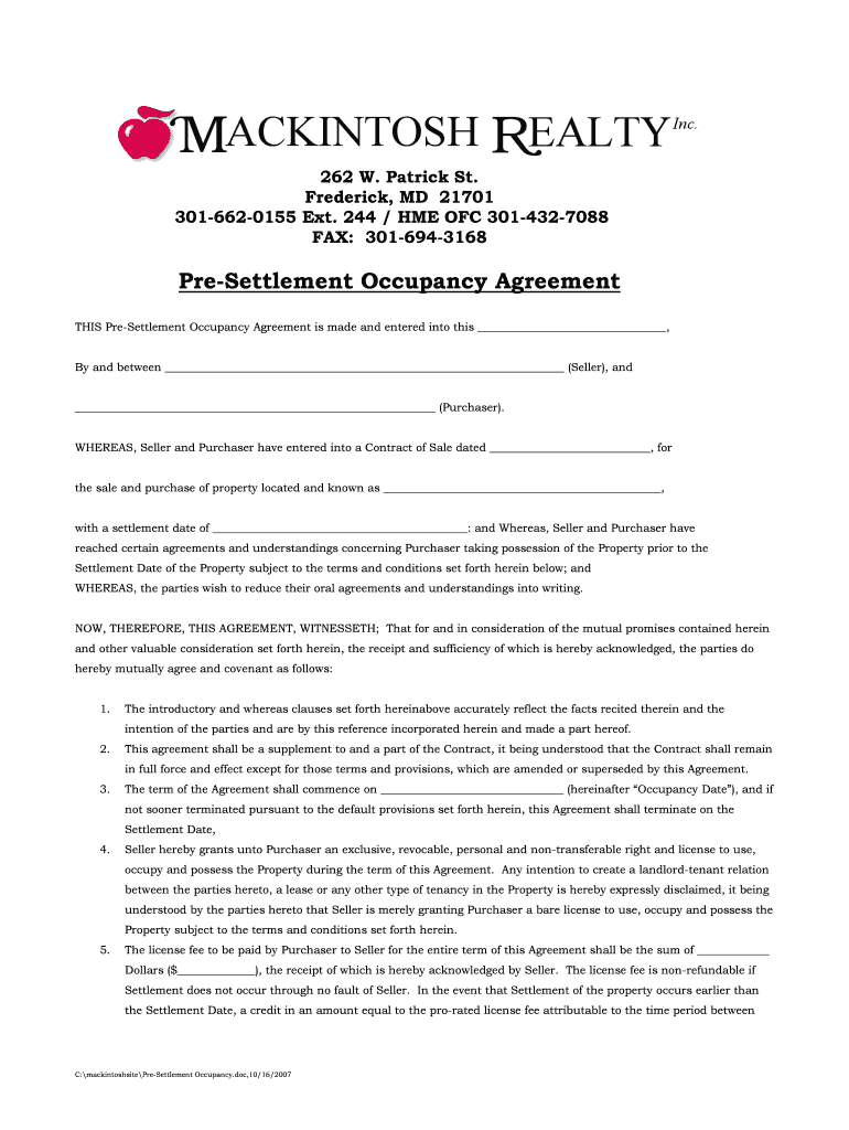 The Pre-Settlement Occupancy Agreement is a legal document used by Buyers and Sellers to outline the terms allowing the Buyer to occupy a property before the closing date.