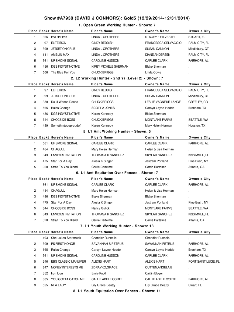 Show #A7938 (DAVID J CONNORS): Gold5 (12/29/201412/31/2014) 1. Open Green Working Hunter Shown: 7 P l a c e B a c k # Horse's Nerdier's Homeowner's Homeowner's City1366Ima Hot Ironing L CROTHERSSTACEY