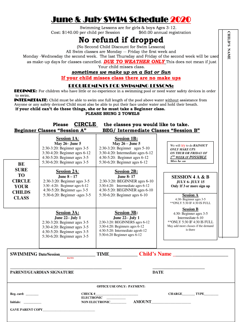 June & July SWIM Schedule 2020 No refund if droppedPHONE(No Second Child Discount for Swim Lessons) All Swim classes are Monday Friday the first week and Monday Wednesday the second week. The last