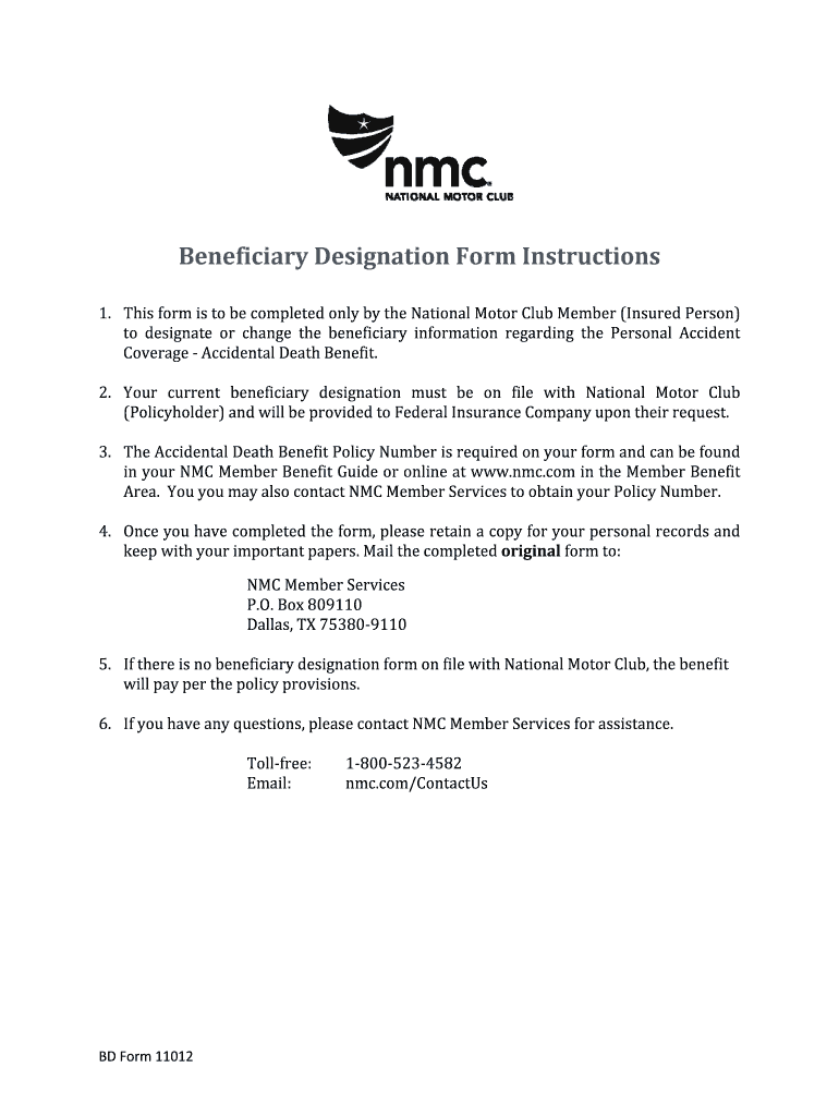 BeneficiaryDesignationFormInstructions 1. ThisformistobecompletedonlybytheNationalMotorClubMember(InsuredPerson) to designate or change the beneficiary information regarding the Personal Accident