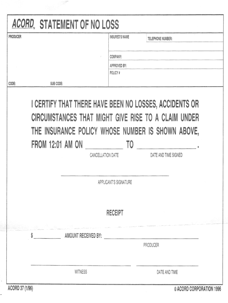 STATEMENTACORD, OF NO LOSSPRODUCERITELEPHONE NUMBER:INSURED IS ACCOMPANY: APPROVED BY: POLICY # CODE:SUB CODE:I CERTIFY THAT THERE HAVE BEEN NO LOSSES, ACCIDENTS ORCIRCUMSTANCESTHAT MIGHT GIVE RISE