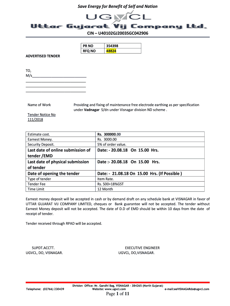 Save Energy for Benefit of Self and National U40102GJ2003SGC042906 PR NO RFQ NO354398 48824ADVERTISED TENDER TO, M/s Name of WorkProviding and fixing of maintenance free electrode earthing as per