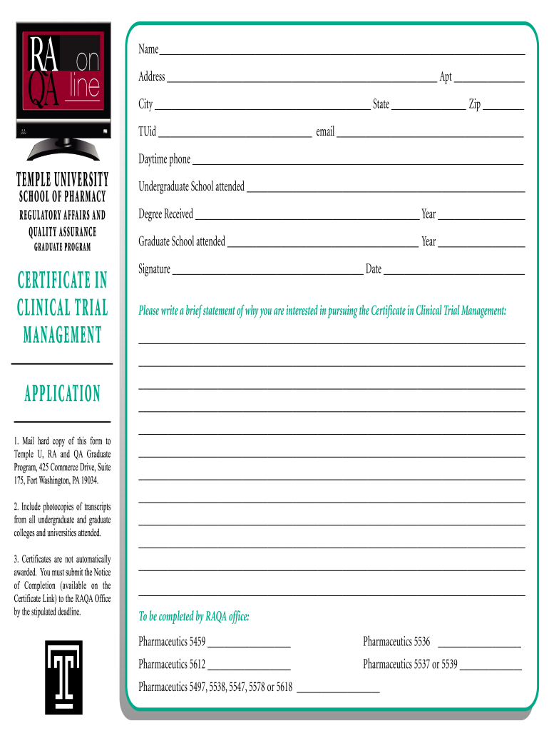 Name Address Apt City State Zip Quid email Daytime phone TEMPLE UNIVERSITY ECHO OF PHARMACY REGAL STORY AFFAIRS AND QUALITY Y ASSURANCE GRADUATE PRO GRAMCERTIFICATE IN CLINICAL TRIAL MANAGEMENTUndergraduate