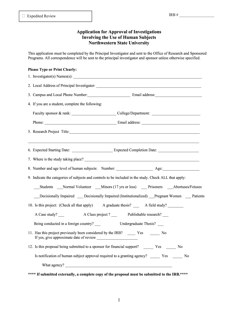 Expedited Review IRB # Application for Approval of Investigations Involving the Use of Human Subjects Northwestern State University This application must be completed by the Principal Investigator
