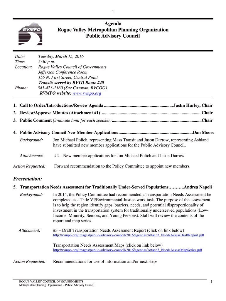 1Agenda Rogue Valley Metropolitan Planning Organization Public Advisory Conciliate: Time: Location:Phone:Tuesday, March 15, 2016 5:30 p.m. Rogue Valley Council of Governments Jefferson Conference
