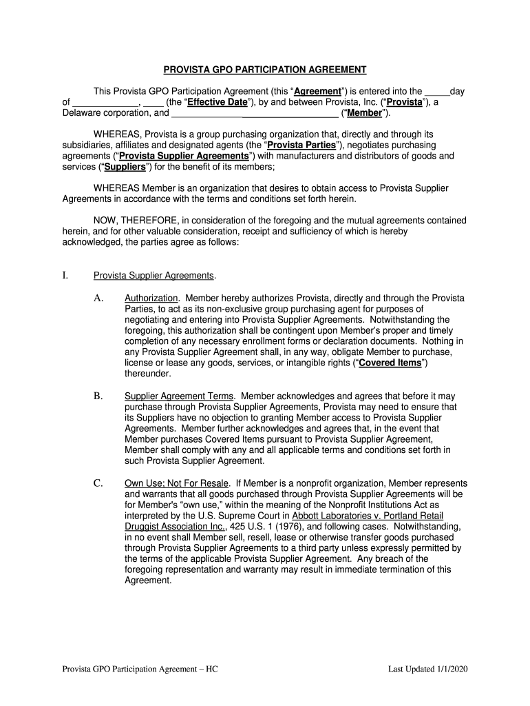 Any organization or company that wishes to become a member of Provista, a group purchasing organization (GPO), needs the Provista GPO Participation Agreement.