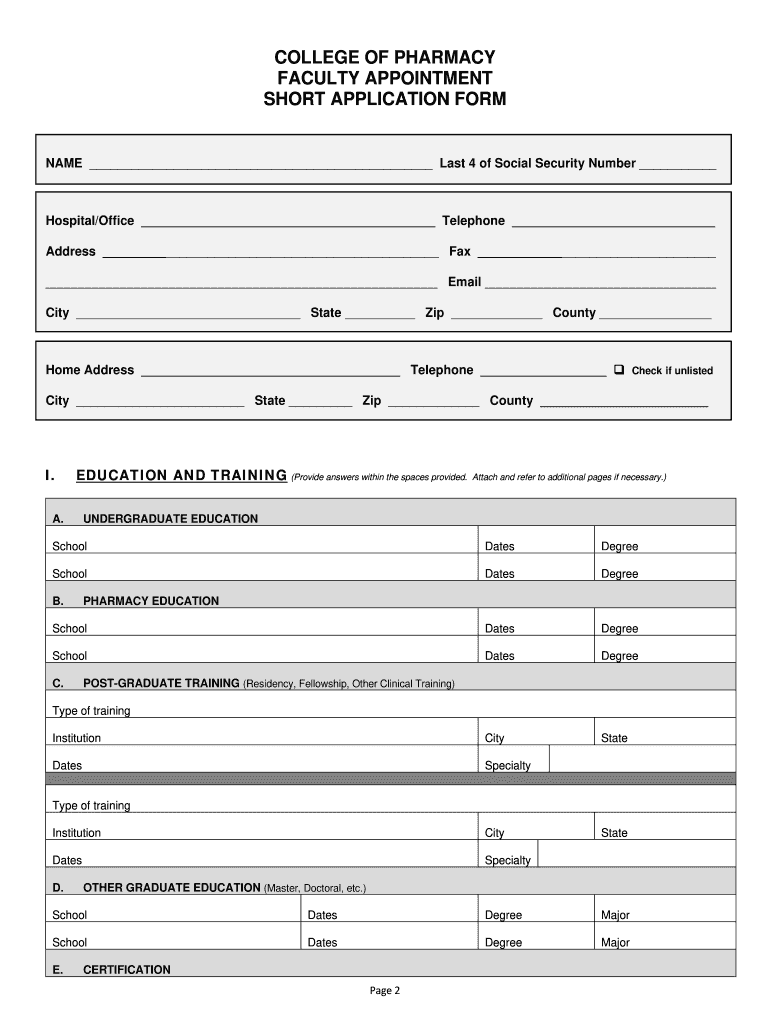 COLLEGE OF PHARMACY FACULTY APPOINTMENT SHORT APPLICATION FORMInstructions and Timelines Instructions for Faculty Application Packet Submission Print and submit all materials as single sided documents.