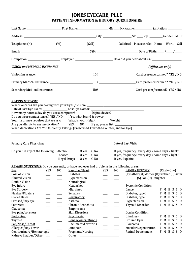 Get the free PATIENT INFORMATION & HISTORY QUESTIONAIRE - Jones Eyecare