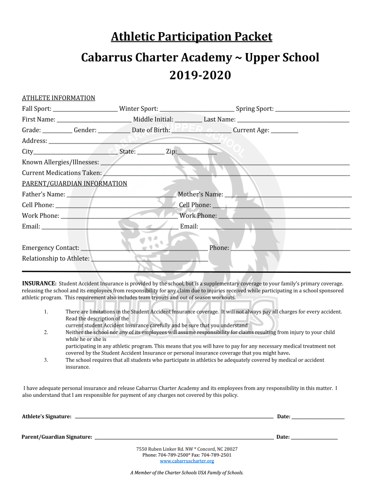 Athletic Participation Packet Cabarets Charter Academy Upper School 20192020 ATHLETE INFORMATION Fall Sport: Winter Sport: Spring Sport: First Name: Middle Initial: Last Name: Grade: Gender: Date