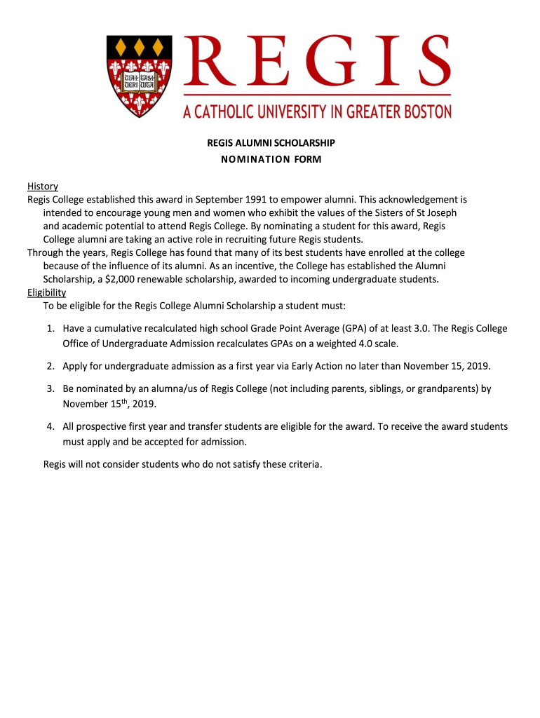 Alumni of Regis University who wish to nominate a candidate for the scholarship are required to file the Regis Alumni Scholarship Nomination.