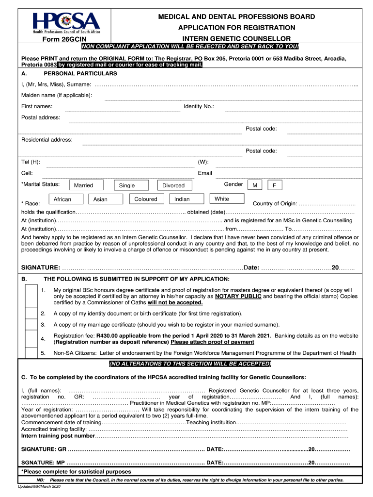 MEDICAL AND DENTAL PROFESSIONS BOARD APPLICATION FOR REGISTRATION INTERN GENETIC COUNSELLORForm 26GCINNON COMPLIANT APPLICATION WILL BE REJECTED AND SENT BACK TO YOU! Please PRINT and return the ORIGINAL