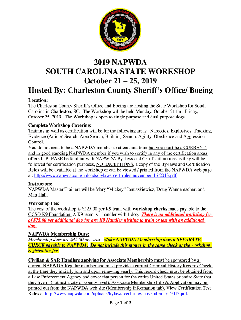 2019 NAPA SOUTH CAROLINA STATE WORKSHOP October 21 25, 2019 Hosted By: Charleston County Sheriffs Office/ Boeing Location: The Charleston County Sheriffs Office and Boeing are hosting the State Workshop