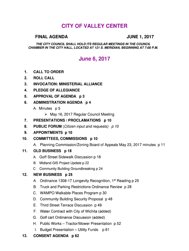 Get the free CITY OF VALLEY CENTER June 6, 2017 - Valley Center, KS