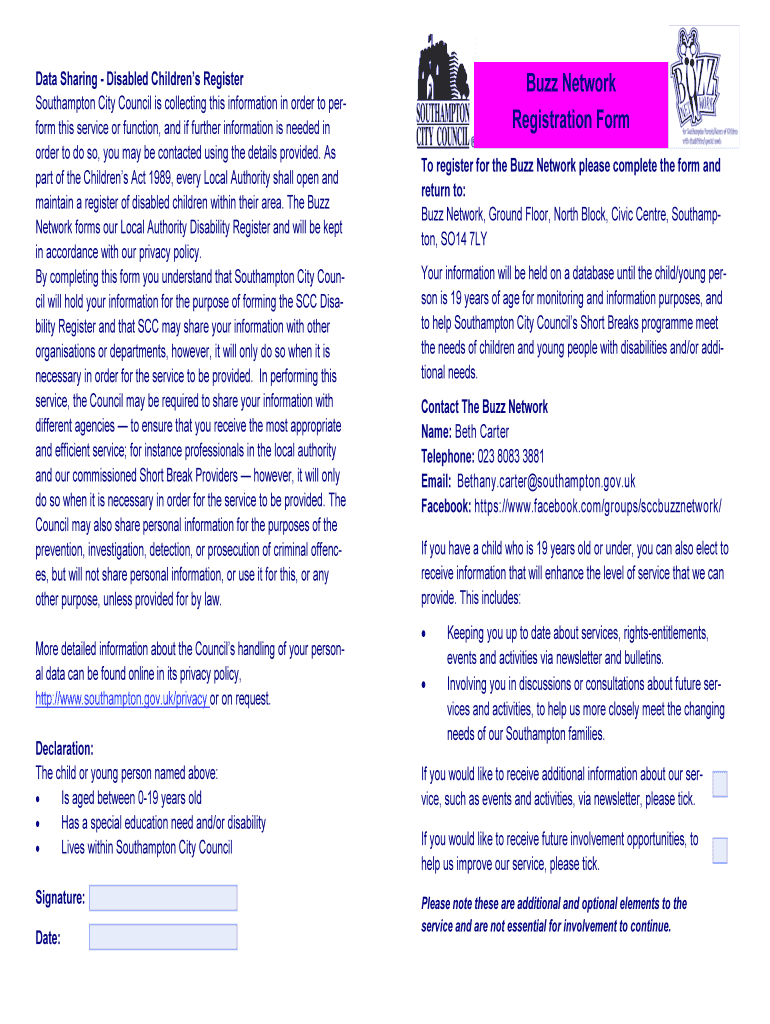Data Sharing Disabled Children's Register Southampton City Council is collecting this information in order to perform this service or function, and if further information is needed in order to do