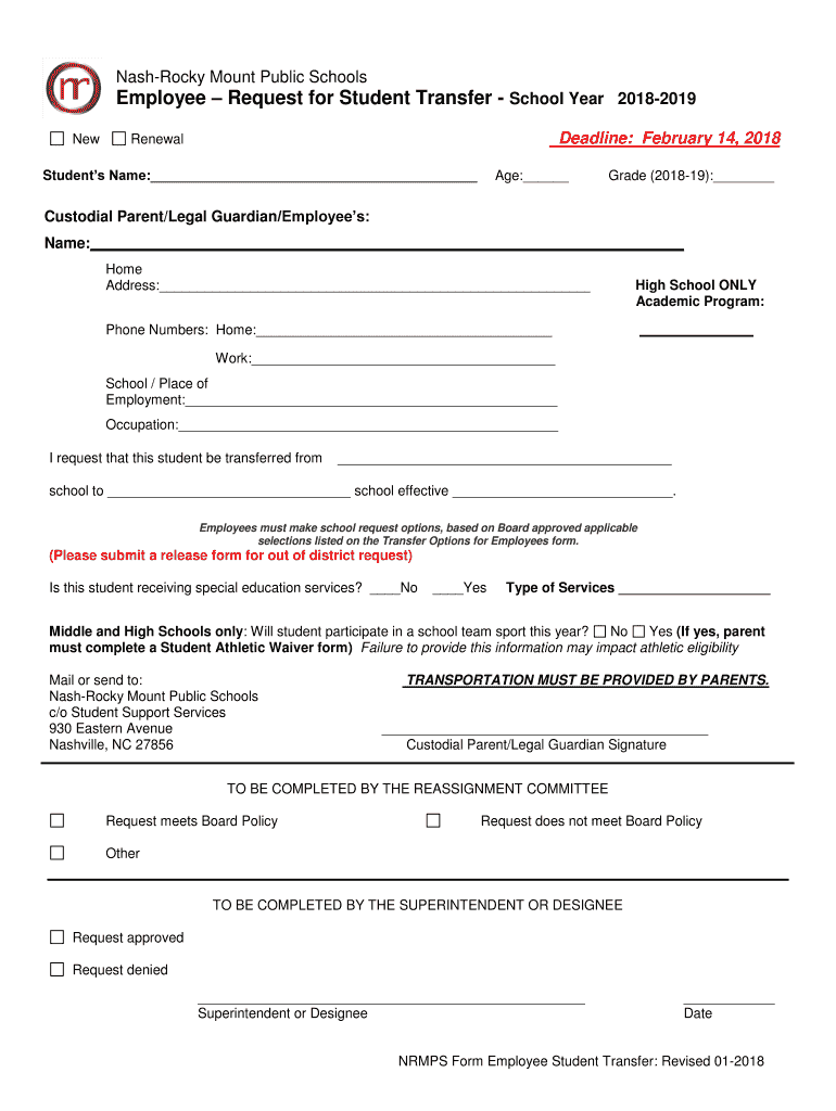 Nash Rocky Mount Public SchoolsEmployee Request for Student Transfer School Year 20182019 Deadline: February 14, 2018RenewalStudents Name: Age: Grade (201819): Custodial Parent/Legal Guardian/Employees: