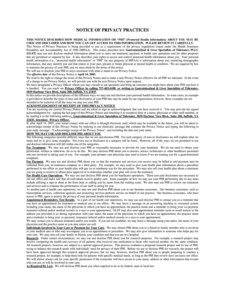 NOTICE OF PRIVACY PRACTICES THIS NOTICE DESCRIBES HOW MEDICAL INFORMATION OR PHI (Protected Health Information) ABOUT YOU MAY BE USED AND DISCLOSED AND HOW YOU CAN GET ACCESS TO THIS INFORMATION.