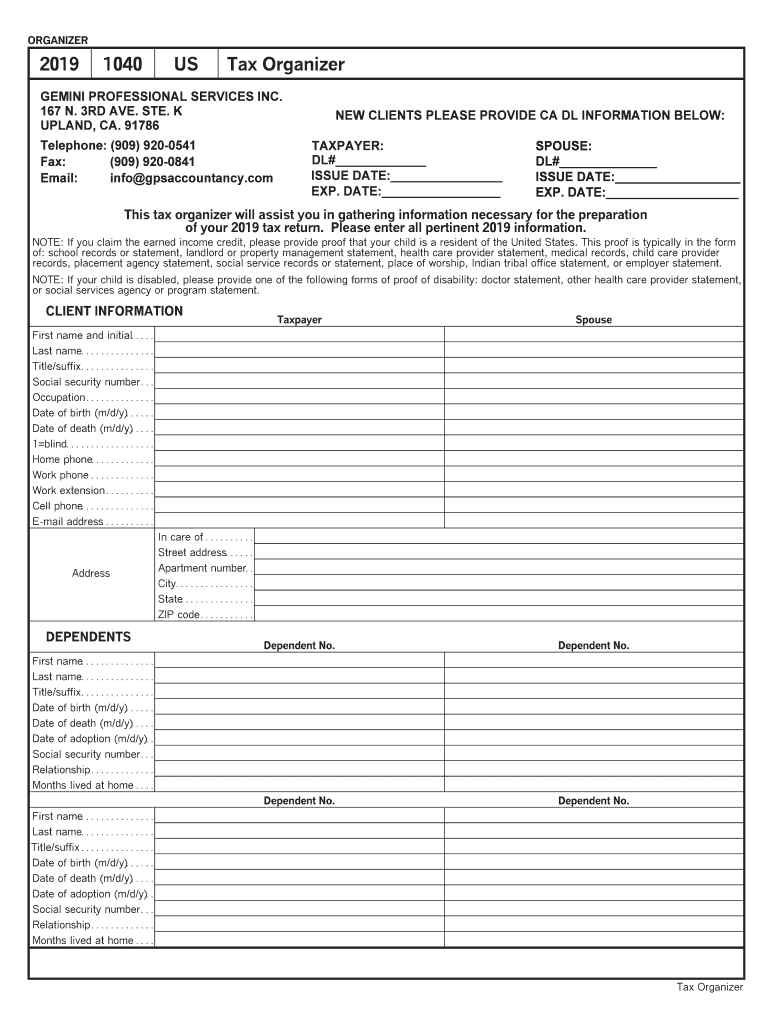 ORGANIZER20191040USTax Organizer*(0,1,352)($66.21/6(59,&(6,1& 15 '$9(67(. UPLAND, CA. 91786 Telephone: () Fax: () Email: LAIR JSVDFFRXQWDQFFRP1(:&/, (1763/($6(3529, '(&$ '/,1)2RMATION BELOW: TAXPAYER: