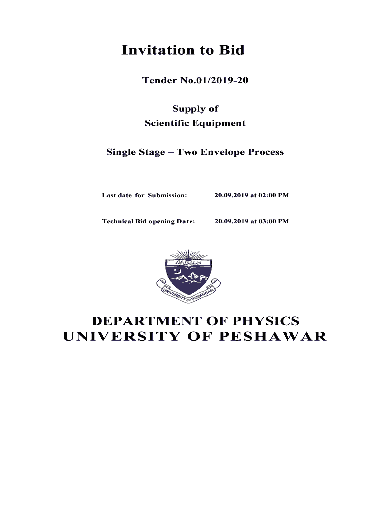Invitation to Bid Tender No.01/201920 Supply of Scientific Equipment Single Stage Two Envelope Processes date for Submission:20.09.2019 at 02:00 Technical Bid opening Date:20.09.2019 at 03:00 DEPARTMENT