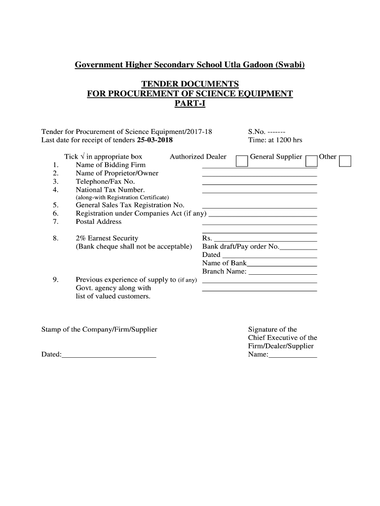 Government Higher Secondary School UCLA Lagoon (Swami) TENDER DOCUMENTS FOR PROCUREMENT OF SCIENCE EQUIPMENT Bartender for Procurement of Science Equipment/201718 Last date for receipt of tenders