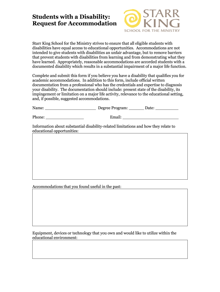 Get the free Disabilities Accommodation Request Form - Starr King School for ...
