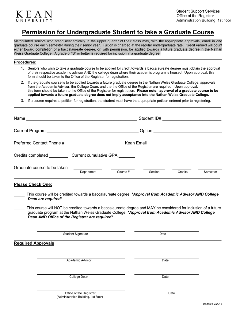 Administration Building, 1st floorPermission for Undergraduate Student to take a Graduate Course