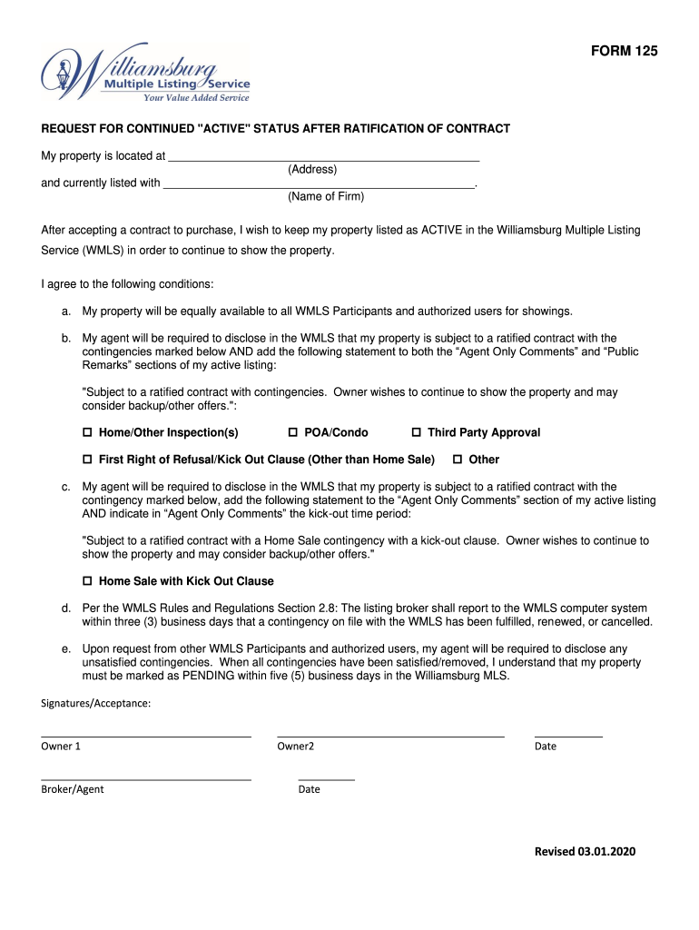 FORM 125REQUEST FOR CONTINUED “ACTIVE STATUS AFTER RATIFICATION OF CONTRACT My property is located at (Address) and currently listed with. (Name of Firm) After accepting a contract to purchase,