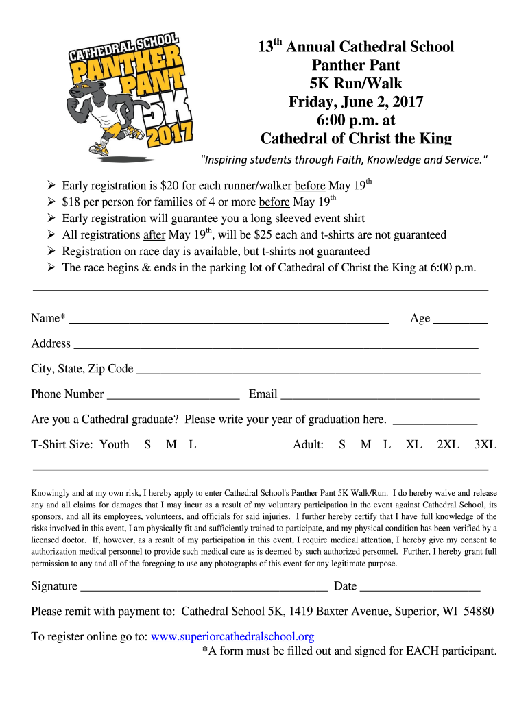 13th Annual Cathedral School Panther Pant 5K Run/Walk Friday, June 2, 2017 6:00 p.m. at Cathedral of Christ the King “Inspiring students through Faith, Knowledge and Service. “ Early registration