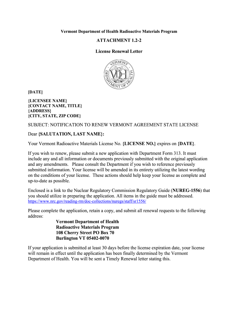 Vermont Department of Health Radioactive Materials ProgramATTACHMENT 1.22 License Renewal Letter DATE LICENSEE NAME CONTACT NAME, TITLE ADDRESS CITY, STATE, ZIP CODESUBJECT: NOTIFICATION TO RENEW
