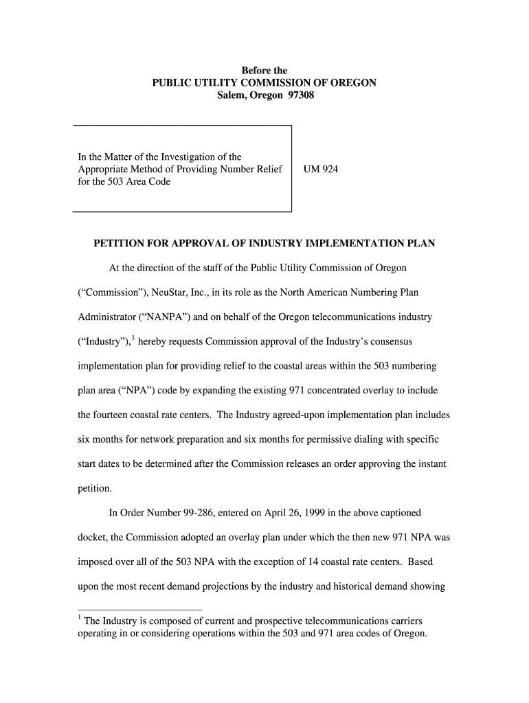 for the 503 Area Code 924PETITION FOR APPROVAL