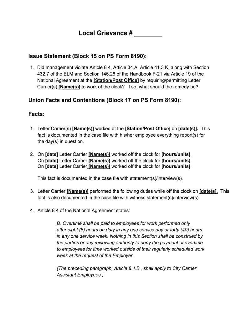 Local Grievance # Issue Statement (Block 15 on PS Form 8190): 1. Did management violate Article 8.4, Article 34. A, Article 41.3. K, along with Section 432.7 of the ELM and Section 146.26 of the Handbook