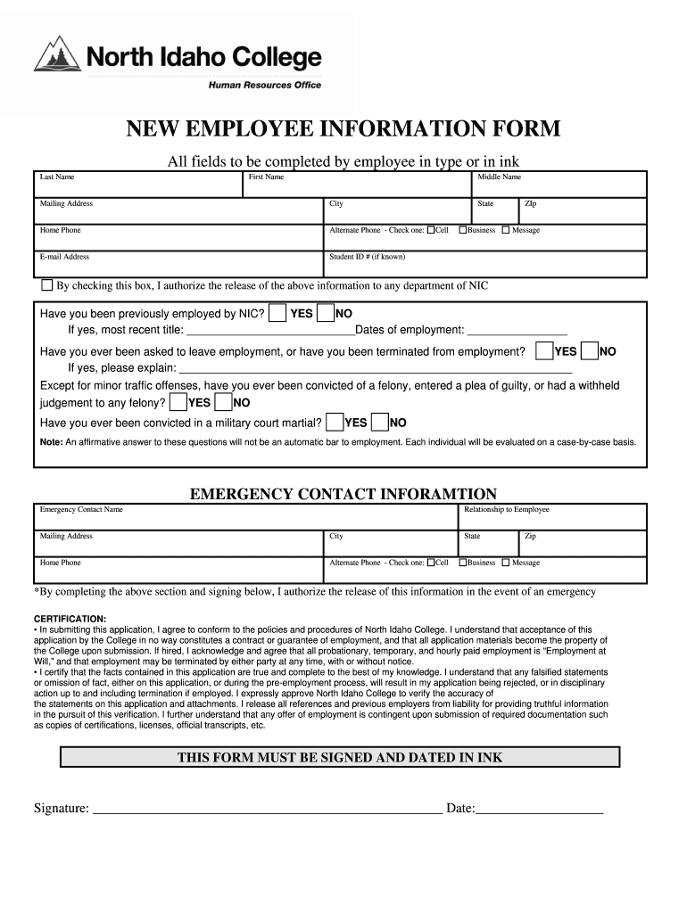 The New Employee Information Form is a document used by North Idaho College to gather personal and emergency contact details from new employees during the onboarding process.