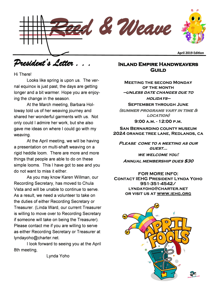 Reed & Weave April 2019 EditionPresidents Letter. . . Hi There! Looks like spring is upon us. The vernal equinox is just past, the days are getting longer and a bit warmer. Hope you are enjoying the