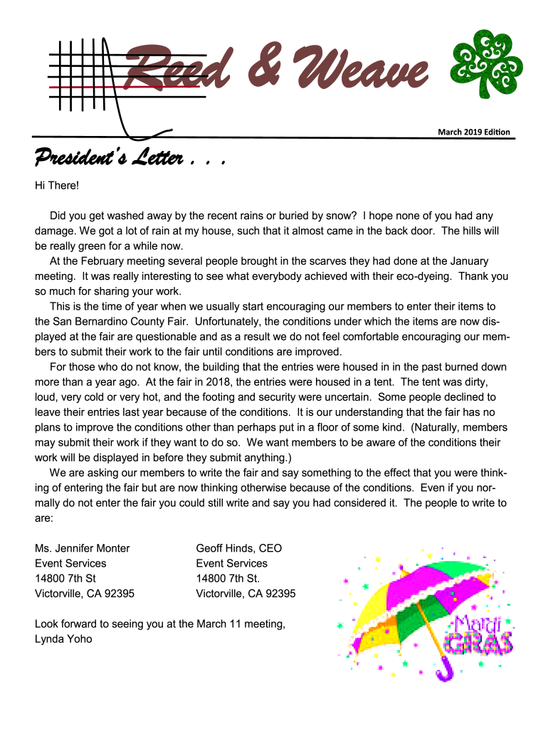 Reed & Weave March 2019 EditionPresidents Letter. . . Hi There! Did you get washed away by the recent rains or buried by snow? I hope none of you had any damage. We got a lot of rain at my house,
