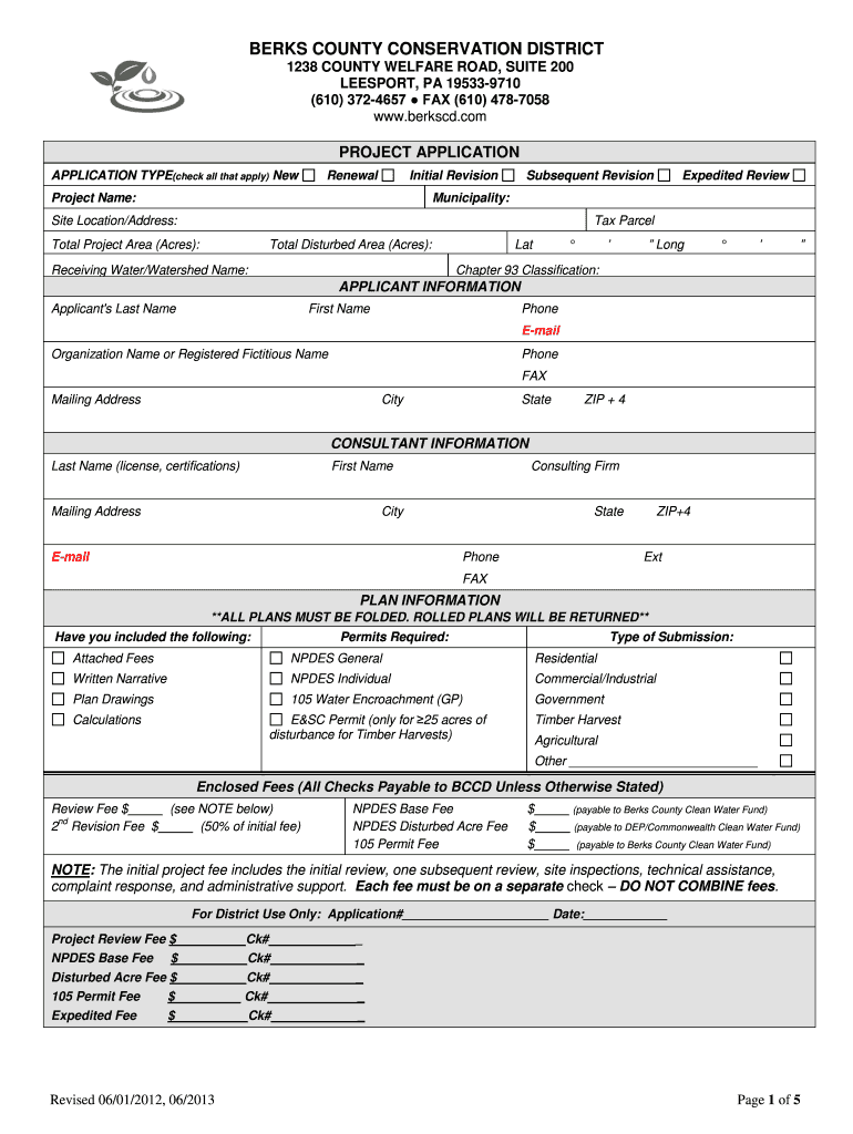 BERKS COUNTY CONSERVATION DISTRICT 1238 COUNTY WELFARE ROAD, SUITE 200 REEXPORT, PA 195339710 (610) 3724657 FAX (610) 4787058 www.berkscd.comPROJECT APPLICATION TYPE(check all that apply) NewRenewalInitial