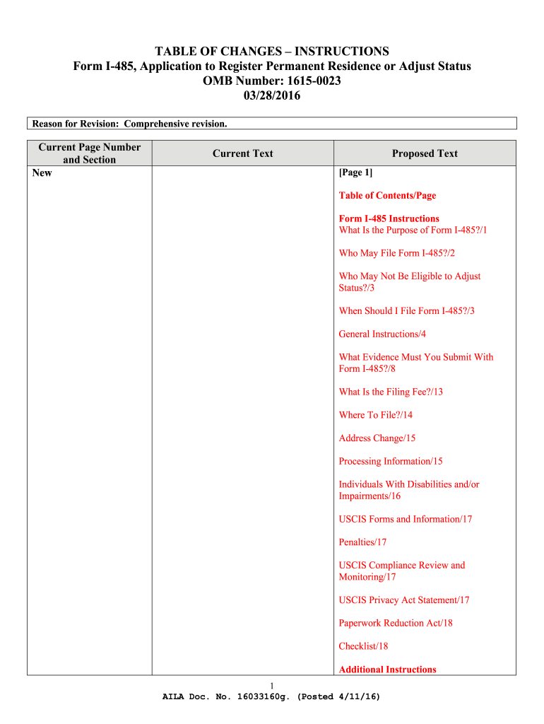 TABLE OF CHANGES INSTRUCTIONS Form I485, Application to Register Permanent Residence or Adjust Status OMB Number: 16150023 03/28/2016 Reason for Revision: Comprehensive revision. Current Page Number
